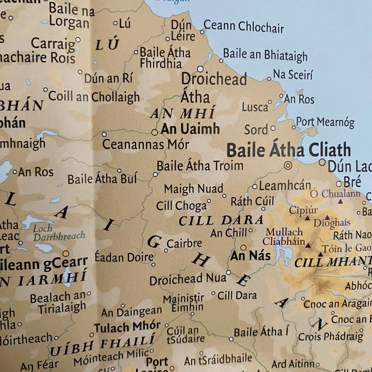 This map illustrates Scotland and Ireland as St. Columba’s Land (Tìr Chaluim Chille in Scottish Gaelic, or Tír Cholm Cille in Irish). The placenames in Scotland appear in Scottish Gaelic (Gàidhlig), while the placenames in Ireland appear in Irish (Gaeilge). This is a geographically accurate map with a different perspective, allowing the viewer to reorient to the concept of a Gaelic world. The arrow in the bottom left corner points to the north. Limited quantities available.